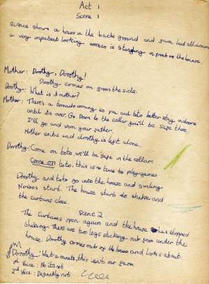 I got here by a bit of a convoluted path! I always wanted to be a writer, ever since I can remember being able to hold a crayon, never mind a pencil. My parents took me and my brothers to the library nearly every weekend, and my mother read to us almost every night, putting on different voices for all of the characters so it was like going to the theatre! I read voraciously as a child and teenager, and was constantly thinking up new stories, plays and even comic books to write. A lot of my early stories were fan-fiction re-tellings of books I’d read, and films and TV programmes I’d watched, as this script I wrote to tell the story of The Wizard of Oz as a play shows.